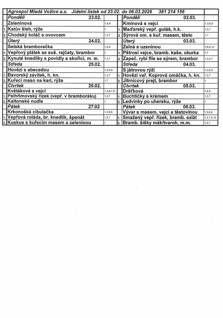 Jídelní lístek od 23.2. do 6.3.2026