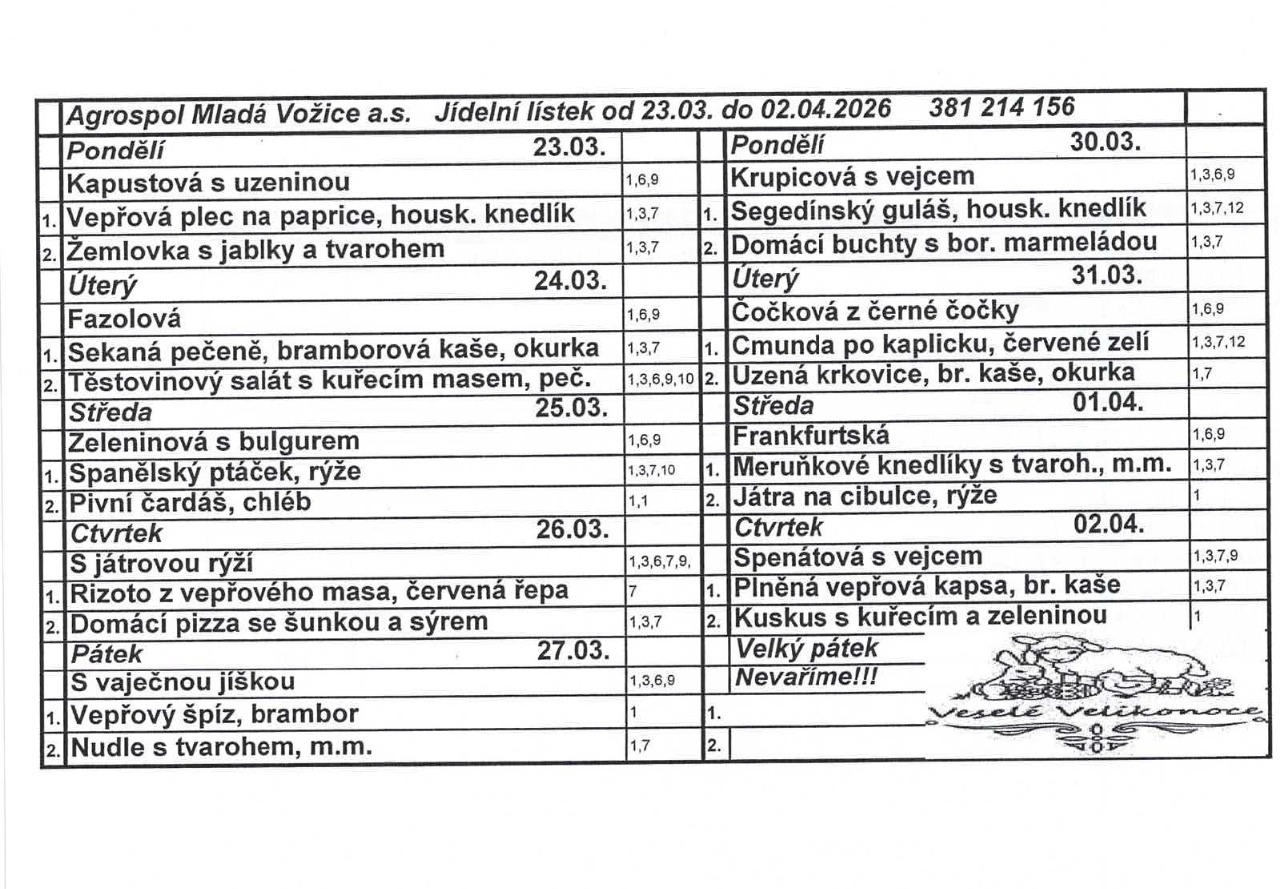 Jídelní lístek od 23.3. do 2.4.2026