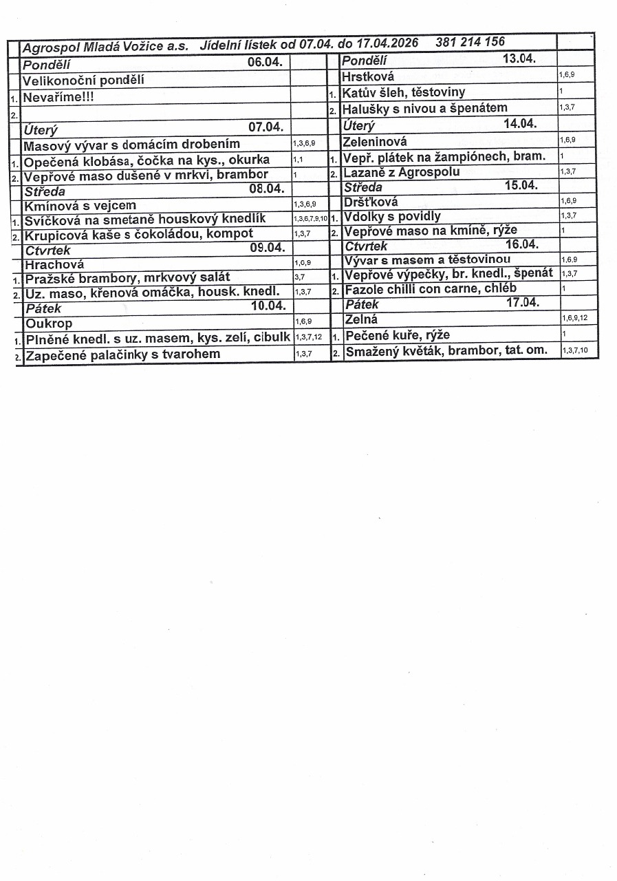 Jídelní lístek od 7.4. do 17.4.2026